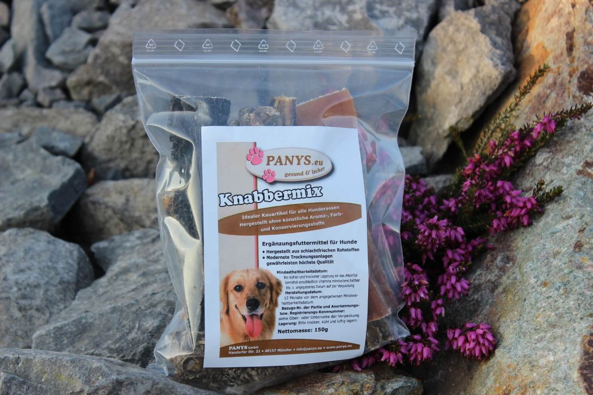 Unsere getrockneten Kauartikel stammen von kontrollierten Schlachthöfen und alle Rohstoffe stammen von Tieren, die amtlich zum menschlichen Verzehr zugelassen sind. Modernste Trocknungsanlagen gewährleisten höchste Qualität. Die frische Ware wird bei 60 - 80 ° zwischen 5 und 7 Tagen getrocknet. PANYS Knabbermix gibt es im praktischen wieder verschließbaren 150 g Beutel. Sollte Ihr Liebling von dem Knabbermix begeistert sein, können Sie diesen auch im 350 g Beutel bestellen.